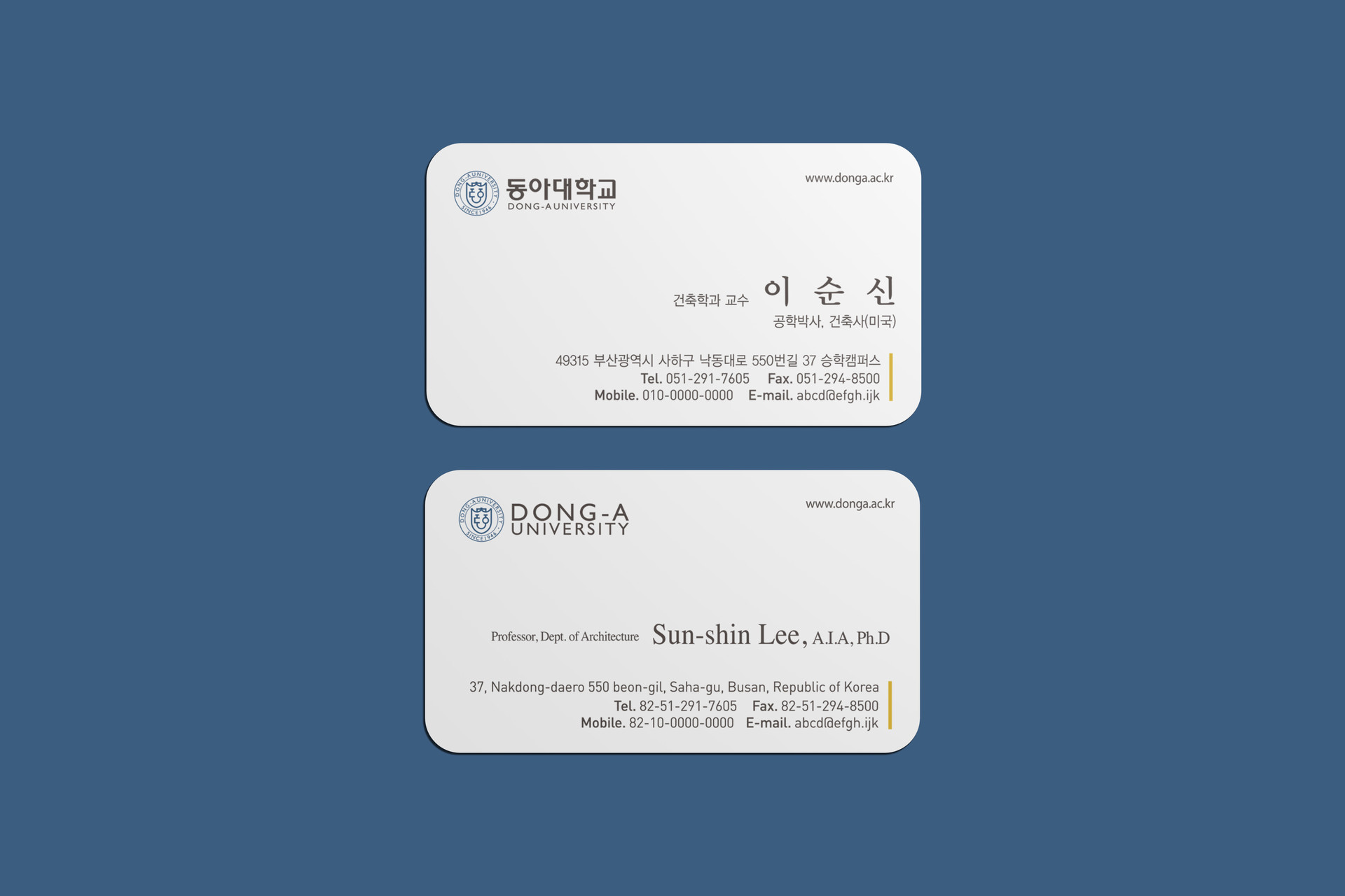 부산광역시의 4년제 사립대학인 동아대학교의 교수 명함입니다. 테두리를 둥글게 후가공하여 평범하지 않으면서도 부드러운 느낌을 줍니다.