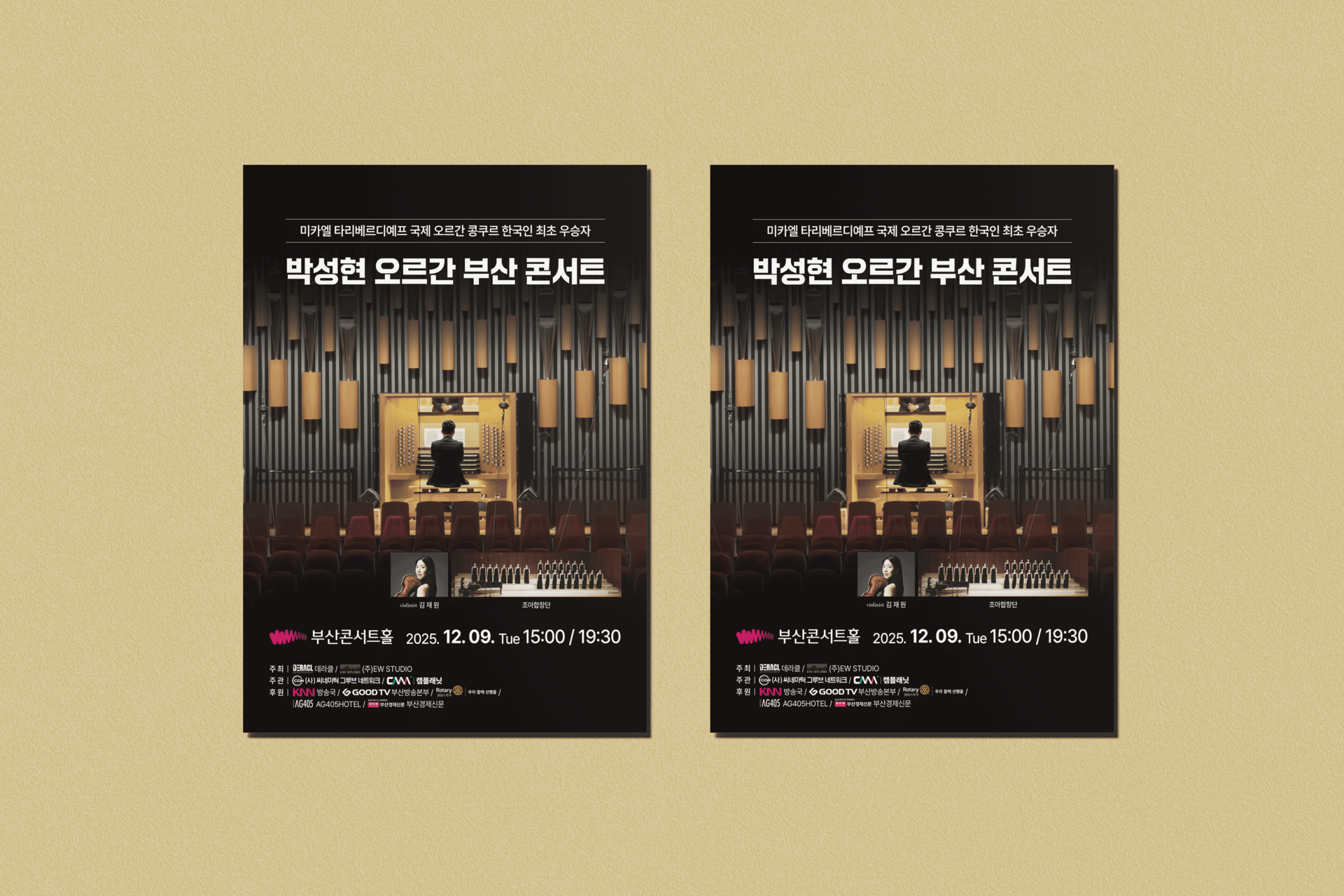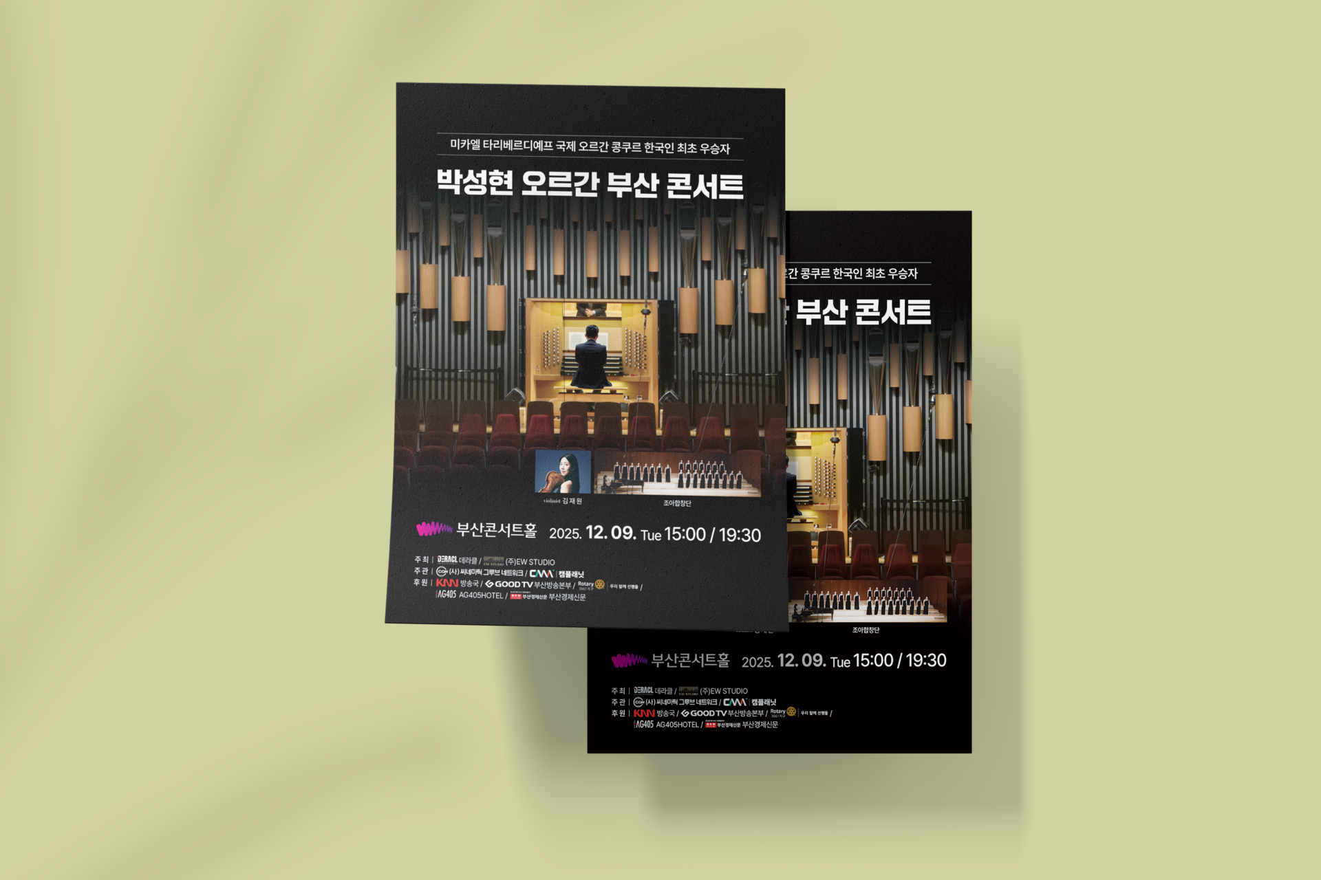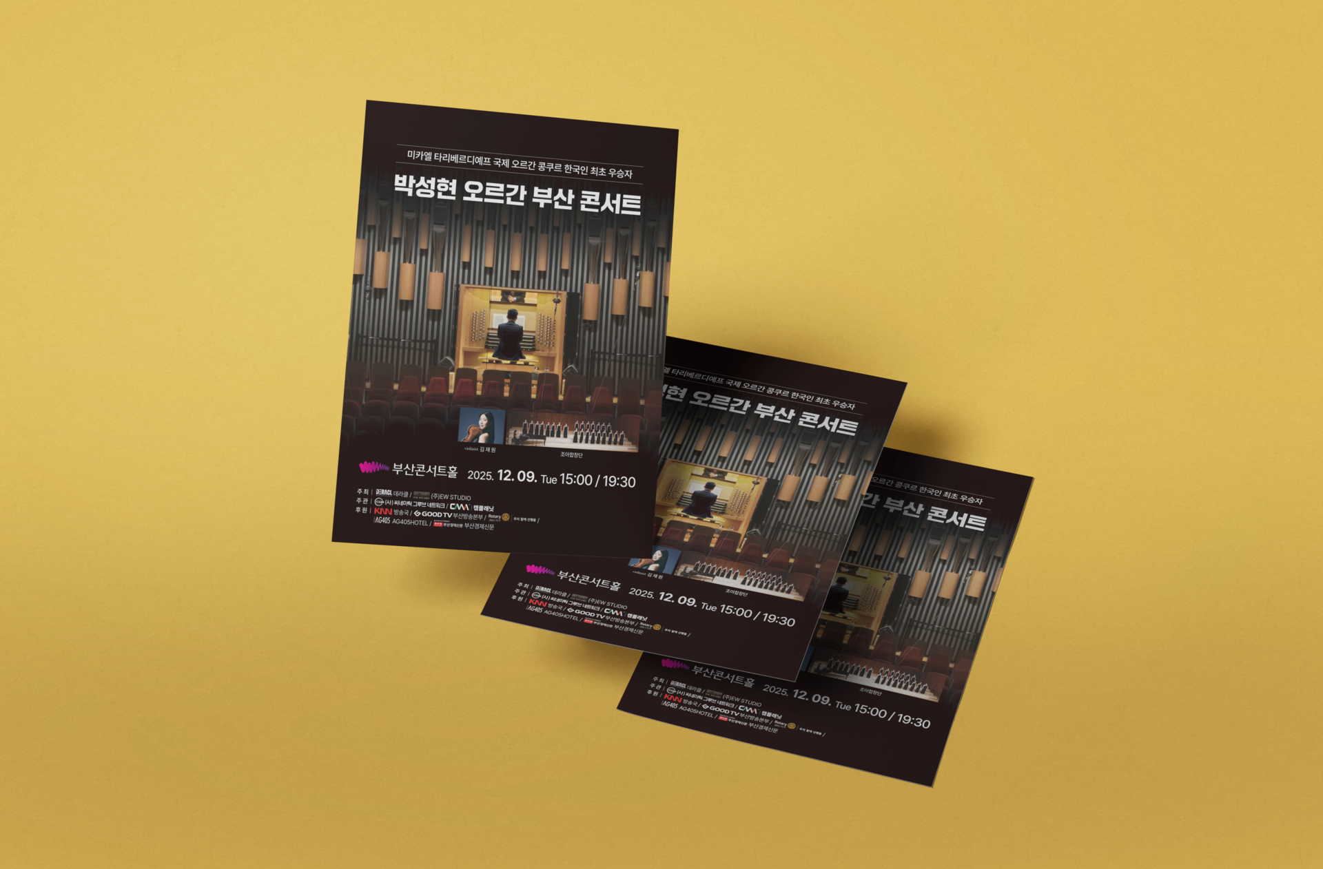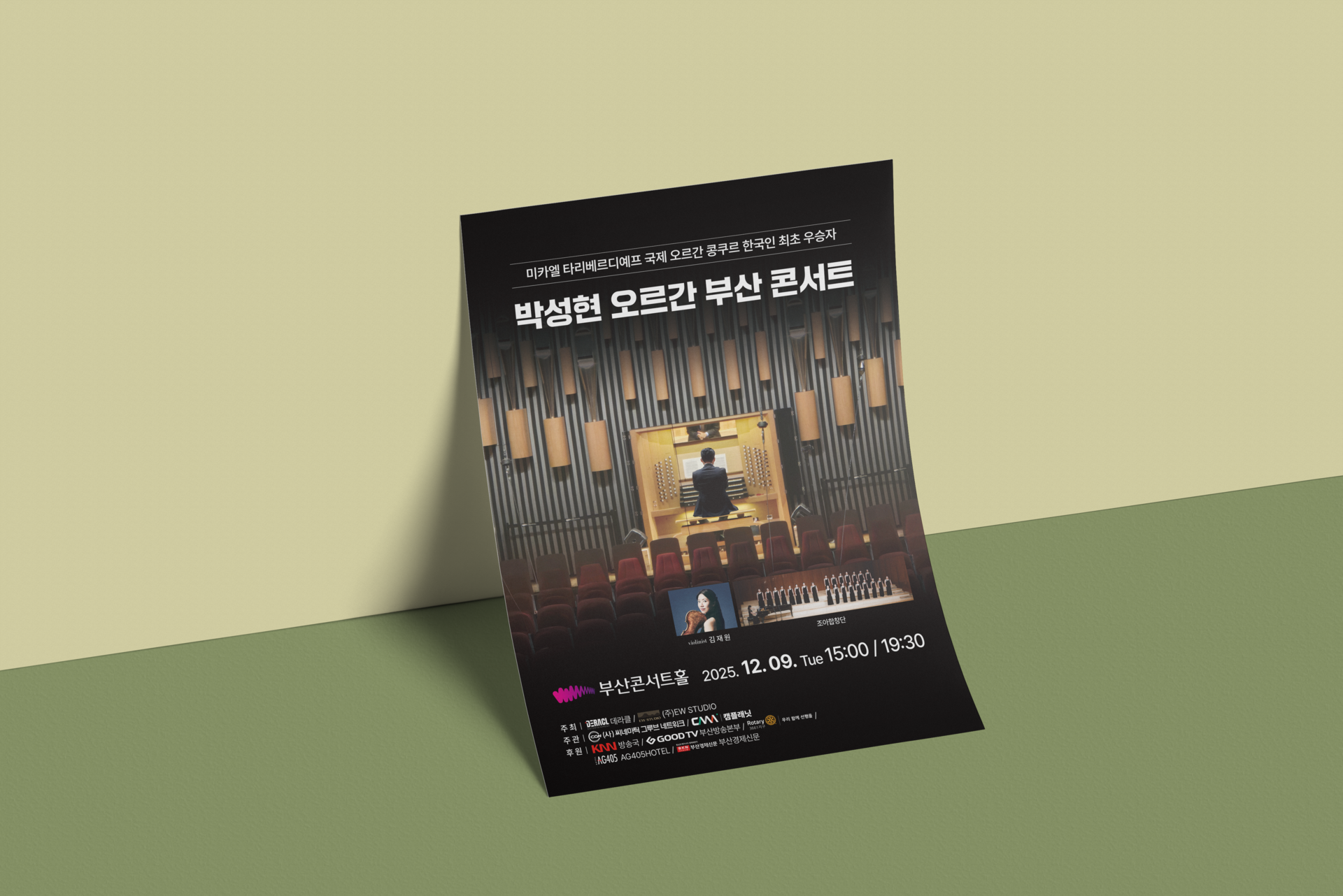 국제 콩쿠르 수상 연주자의 무대를 담아낸 오르간 콘서트 포스터로, 공연의 깊이와 공간의 상징성을 시각적으로 표현했습니다.